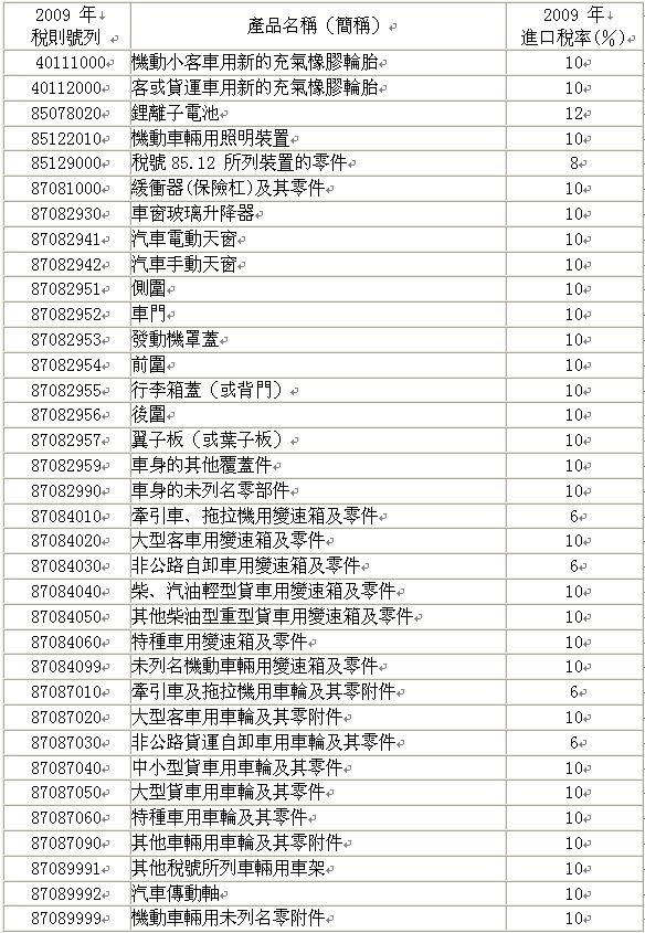 表2大陸方麵早期收獲產品清單(汽車零組件)