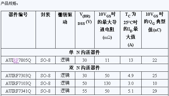IR 亞太區銷售副總裁潘大偉表示:“由於可以滿足寬泛電壓的要求並采用 SO-8 封裝和 IR 的平麵技術,我們的最新係列 MOSFET 可以提供堅固緊湊的解決方案,非常適合需要用堅固 MOSFET 驅動阻性和感性負載的應用。”