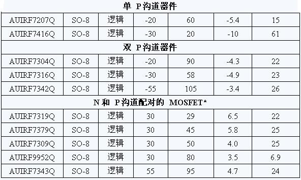 新係列 MOSFET 器件采用 IR 經過驗證的平麵技術和 SO-8 封裝,內含單雙 N/P 溝道器件,除了集成在單一封裝上的N/P溝道器件,還提供堅固、緊湊的係統解決方案,以驅動汽車應用中的多個輸出或半橋電路。