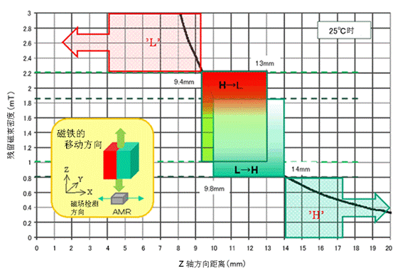 AS係列能夠通過磁鐵和傳感器之間的距離改變來檢測出磁通密度的變化,控製傳感器輸出信號的開關(高(H)<=>低(L)),如圖5所示。當磁鐵接近傳感器,使磁場的強度變大,則傳感器的輸出就會由“高”變“低”,反之則由“低”變“高”。