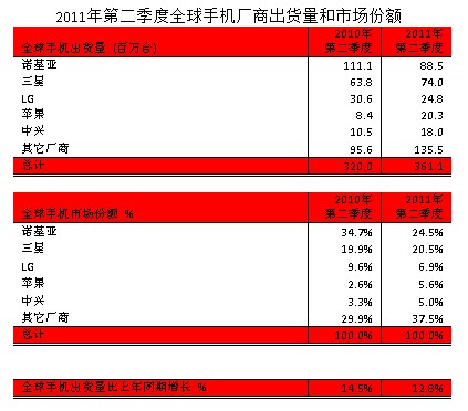 “盡管全球範圍發生多重債務危機和經濟動蕩,手機市場依然發展勢態良好。2011年二季度全球手機出貨量比去年同期增長13%,達到3億6110萬台。”StrategyAnalytics高級分析師AlexSpektor評論道,“蘋果表現出眾,其出貨量達到創紀錄的2030萬台,與LG的差距縮小到僅差一點幾個百分點。LG的3G智能手機出貨量迅速攀升,但其2G功能手機和基本手機(basicphONe)增長緩慢。”