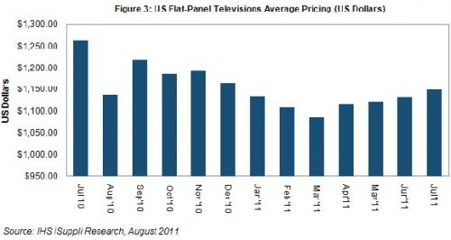 高檔品牌與價值品牌在同樣的市場環境中激烈競爭。IHS iSuppli公司的研究顯示,7月美國平板電視價格連續第四個月環比上漲。平均銷售價格為1150美元,比6月上升1.5%,但比2010年7月下滑9%,如圖所示。尤其是,今年上半年推出的新型號銷售增長,在市場疲弱之際幫助支撐了需求。零售商也報告稱,由於價格較低,32英寸及更小尺寸的電視銷售情況改善。