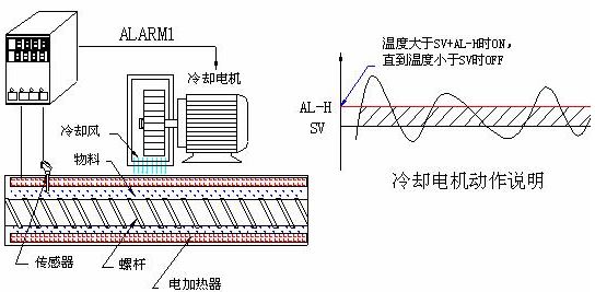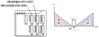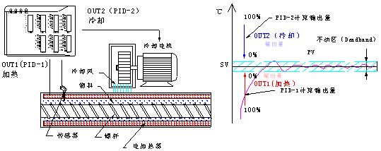 DTE10T在擴展輸出模塊後,SUB1輸出口可定義為冷卻輸出控製。利用雙PID計(ji)算(suan),在(zai)溫(wen)度(du)沒(mei)有(you)衝(chong)過(guo)設(she)定(ding)值(zhi)時(shi),溫(wen)控(kong)器(qi)就(jiu)可(ke)提(ti)前(qian)啟(qi)動(dong)冷(leng)卻(que)風(feng)機(ji),避(bi)免(mian)了(le)溫(wen)度(du)從(cong)高(gao)不(bu)下(xia)的(de)情(qing),並(bing)能(neng)保(bao)持(chi)溫(wen)度(du)穩(wen)定(ding)性(xing)。個(ge)人(ren)認(ren)為(wei)報(bao)警(jing)驅(qu)動(dong)的(de)冷(leng)卻(que)模(mo)式(shi)總(zong)將(jiang)由(you)於(yu)控(kong)溫(wen)不(bu)穩(wen)定(ding)等(deng)原(yuan)因(yin)被(bei)淘(tao)汰(tai)。雙(shuang)PID控製方式必定是追求更高控溫精度的首選。如圖5所示。