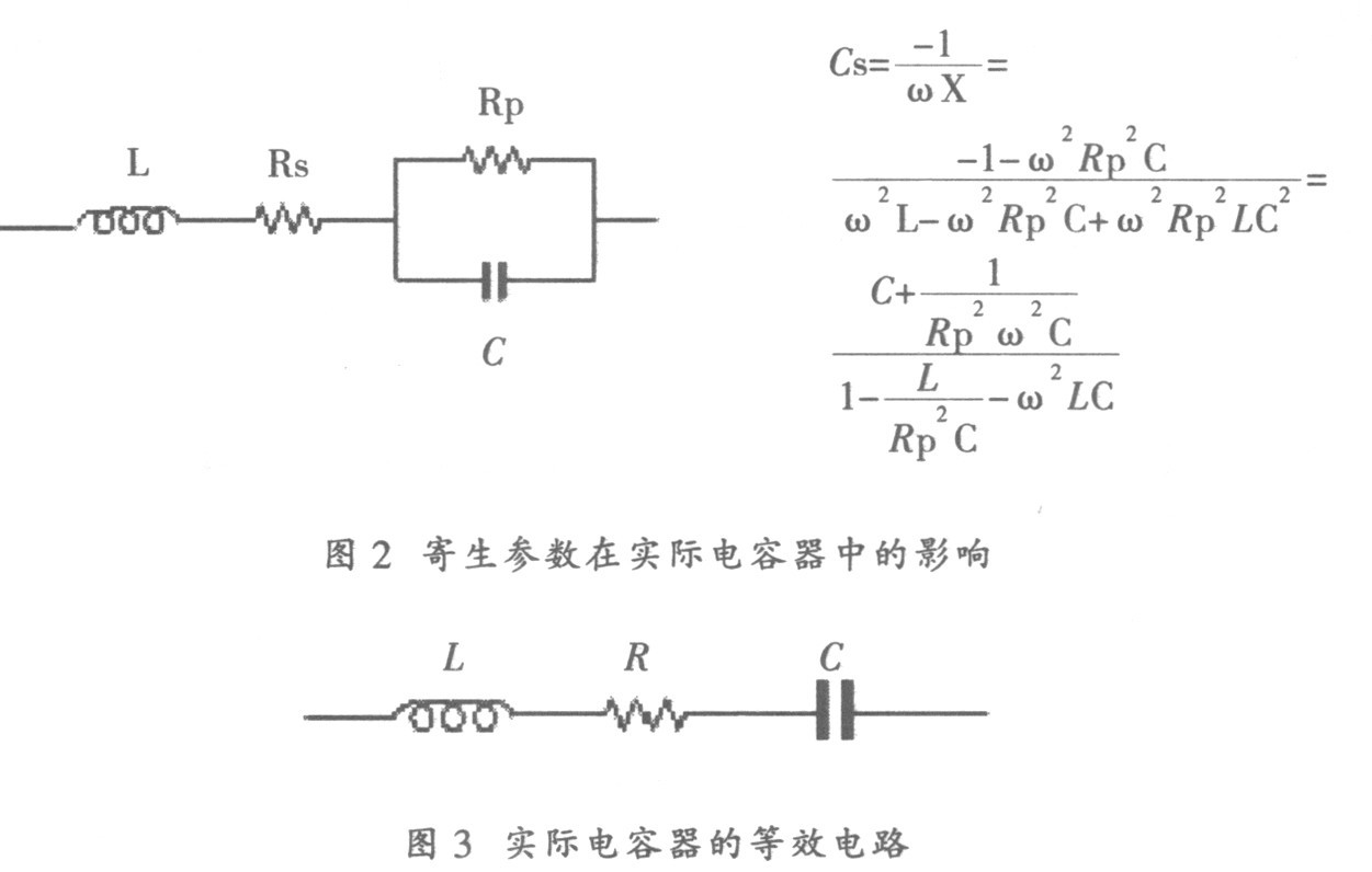 電容器的典型等效電路如圖1 所示, 在該電路中, 電容量C 是電容器的主要成分, Rs 和L 是引線和電極中存在的寄生參數, Rp 代表兩個電極間的寄生泄漏參數。