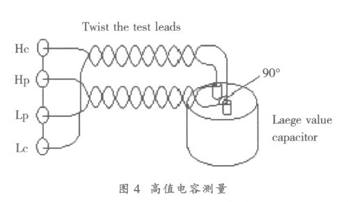 在電容器的測量中, 應注意的事項與被測電容量有關, 高值電容測量屬於低阻抗測量, 因此必須把接觸電極、測試夾具和電纜中的接觸電阻及殘餘阻抗減到最低, 應使用4 端、5 端或4 端對配置把DUT 接到儀器上。在使用4 端和5 端配置時, 必須確保高測試信號電流流過電纜, 為避免電磁場耦合的影響, 按圖4 所示的方式來連接電纜;此外, 為進行精確測量, 應正確使用開路、短路補償。特別是對於施加直流偏置電壓的電解電容器,應在直流偏置設置為ON (0 V) 時進行開路/短路補償。