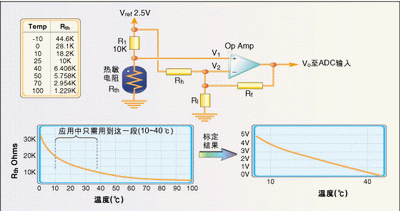 有時需要對熱敏電阻的輸入進行標定以便得到合適的溫度分辨率,圖3是一個將10~40℃溫度範圍擴展到ADC整個0~5V輸入區間的電路。運算放大器輸出公式如下: