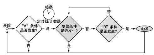 源自電腦編程領域的IF-THEN-ELSE構成了這類觸發結構的概念模型。如圖1所示,這些語句還包括其它判定符(如A和B之間的定時器/計數器)。不管B事件是否發生,在A事件之後隨時都可以發生複位。