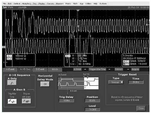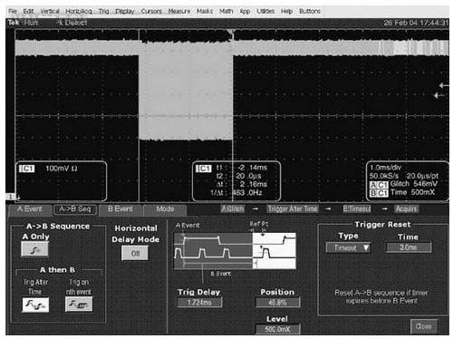 在這一過程中,A事件啟動延遲計數器,計算脈衝數量。一旦產生了32個脈衝,它會使B觸發器監測第33個脈衝。當檢測到特定脈寬時,B係統便設成觸發采集,這時,示波器觸發並記錄數據。如果沒有第33個脈衝,複位條件會重新準備A觸發器,再次啟動整個流程。