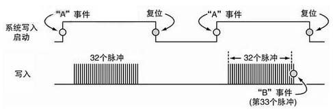 本係統中,讀/寫電路中的一個單元設計成在每個有效係統寫入啟動(WE)周期中執行一串32條寫入命令。圖2描述了較大的周期時間與導致數據寫入的各個脈衝的關係。