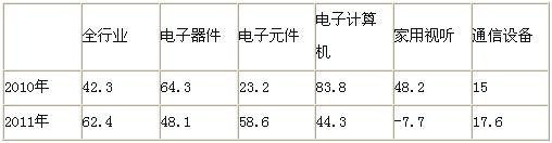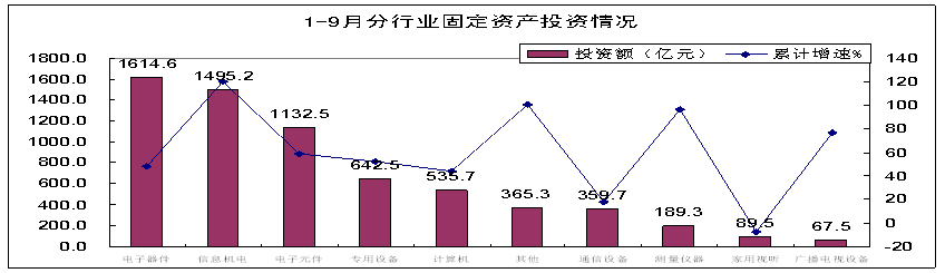 前三季度,電子元件、器件和信息機電行業分別完成投資1133、1615和1495億元,同比增長58.6%、48.1%和120.2%,三個領域投資占全行業的65%,比重比去年提高3個百分點,對全行業投資增長的貢獻率分別達到17%、21%和33%。整機行業投資增長放緩,其中視聽行業完成投資89.5億元,同比下降7.7%, 比重(1.4%)下降1個百分點;通信設備行業完成投資360億元,同比增長17.6%,比重(5.5%)下降2.1個百分點;計算機行業在平板電腦等新產品帶動下,在整機行業中增長相對較快,同比增長44.3%,但仍低於全行業18.1個百分點,其中9月份投資下降20.1%。