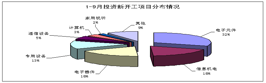 前三季度,電子信息產業500萬元以上項目完成固定資產投資6492億元,投資額超過去年全年水平近500億元,同比增長62.4%,增速高於工業投資35.9個百分點。其中9月份完成投資889.6億元,同比增長35.6%,增速比8月下降35.2個百分點,這是今年以來第二個月月度投資增速低於60%。