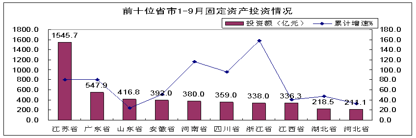 前三季度,東部10省市完成投資3825億元,同比增長74.9%,增速高於去年同期26.3個百分點;江蘇、廣東、浙江、北京投資上升較快,增速均超過80%,特別是江蘇省完成投資1546億元,占全國總投資的近四分之一。中部6省完成投資1557億元,同比增長60%,其中安徽、河南投資增長突出,分別居全國第四、五位,增長51.2%和116.4%。西部12省市完成投資836億元,同比增長53.5%,其中四川省投資359億元,占西部地區的43%,同比增長95.4%。東北三省完成投資274億元,同比下降6.2%。