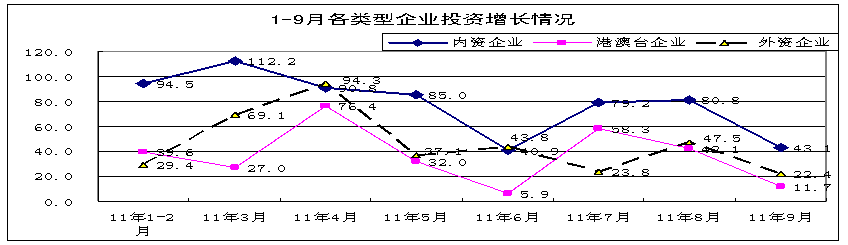 前三季度,內資企業完成投資4821億元,占全行業的74%,同比增長72.9%,高於全行業10.5個百分點,其中私營企業增勢突出,同比增長達107.4%。外商投資和港澳台企業分別完成投資961和710億元,同比增長42.1%和33.7%,低於全行業20.3和28.7個百分點,其中9月份分別增長22.4%和11.7%。
