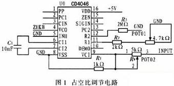 圖l為占空比調節電路。該電路是將調節器輸出的電壓信號作為壓控振蕩器VCO(Voltage CONtrolled Oscillator)的輸入信號,此信號是一個在0~5 V之間變化的直流電壓信號,即INPUT信號,由於VCO是一個電流控製振蕩器,對定時電容C1的充電電流與從引腳9輸入的控製電壓成正比,使VCO的振蕩頻率正比於該控製電壓。當VCO控製電壓為0 V時,其輸出頻率最低;當輸入控製電壓等於電源電壓VDD時,輸出頻率則線性增大到最高輸出頻率。VCO振蕩頻率的範圍由R1、R2和C1決定。VCO振蕩頻率由CD4046的引腳4直接輸出到CPLD處理單元,CPLD內部通過對該脈衝信號的計數來控製逆變觸發脈衝的寬度,來調節觸發脈衝的占空比。