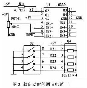 圖2為軟啟動時間調節電路。該電路單元是將調節器輸出信號作為電壓比較器LM339的輸入信號,此信號是一個在0~5 V之間變化的直流電壓信號(即INPUT信號)。按照設計要求,LM339的引腳6給定電壓為1 V,當INPUT信號的電壓大於l V時,LM339的引腳l通過上拉電阻輸出一個高電平作為啟動信號送入CPLD。在CPLD內部通過調節外部的撥段開關控製比較器的輸出,從而控製軟啟動的時間。