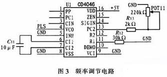 圖3為頻率調節電路。通過調節CD4046外接電位器POTll,控製VCO輸出脈衝的頻率,根據設計要求,該電路將輸出一個變化範圍在1~6 kHz之間的脈衝信號PLS,將該信號作為CPLD的輸入信號。在CPLD內部通過計數延時和占空比設計要求,最終輸出一個頻率在400~3 000 Hz之間符合占空比要求的逆變觸發信號,並可通過POT11調節該信號的頻率。