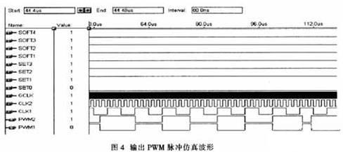該係統軟件設計是根據係統功能要求而設計的,基於EPM7128的軟件程序設計分為:輸出脈衝占空比調節、頻率調節、軟啟動時間調節和過壓過流報警。開發係統使用VHDL語言進行模塊化編程,這樣可以提高程序的移植性,縮短開發周期,降低開發成本。而且易於維護係統軟件,提高可靠性。圖4是輸出的兩路PWM脈衝仿真波形,其中GCLK是一個基準時鍾源,CLKl和CLK2分別是經VCO轉換的頻率調節和占空比調節信號,SET和SOFT分別是2個外接的4位占空比調節和軟啟動調節撥段開關。