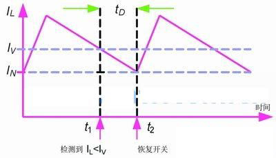 一般而言,通常采用比較器來檢測IL是否超出IV,以決定關斷或重新開通。可是,比較器會帶來延時tD,影響閾值的有效值。如圖2所示,比較器在t1時刻檢測到IL< p> V,可是偶遇延時tD,開關會在t2時刻被恢複。基於這個原因,有效閥值IN便會低於IV,這樣,實際的輸出IOUT(CL)為: