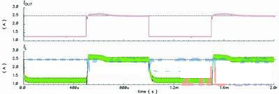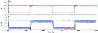 為了說明這個方案,圖1中的降壓轉換器會采用這些配置:L=20mH、COUT=47mF、RL值在2.64W(正常模式)~1.1W(電流限製模式)間轉換,並會使用一個tD=100ns的比較器,而IOUT(CL,DES)和IL(RIPPLE)分別是2.5A和0.3A。不過,如果使用傳統的峰值電流限製方法,那麼式(1)中的IV便會設定為2.35A,傳統方法的模擬結果如圖4所示。由此可以看到,IOUT(CL)會由於tD的影響而低於2.5A。然而,使用新方法並將ILR設定在2.5A,IOUT(CL)便可如圖5所示達到2.5A。於是,傳統方法中出現的問題便能夠在該方案中解決。