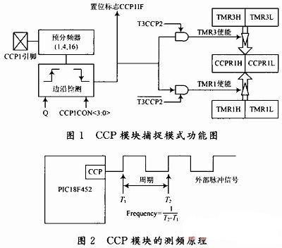 使用PIC18F452進行頻率測量的原理如圖2所示:設置CCP模(mo)塊(kuai)工(gong)作(zuo)於(yu)捕(bu)捉(zhuo)模(mo)式(shi),並(bing)且(qie)讓(rang)它(ta)在(zai)每(mei)個(ge)上(shang)升(sheng)沿(yan)捕(bu)捉(zhuo)一(yi)次(ci)數(shu)據(ju),由(you)相(xiang)鄰(lin)兩(liang)個(ge)上(shang)升(sheng)沿(yan)到(dao)來(lai)的(de)時(shi)間(jian)差(cha)就(jiu)可(ke)以(yi)得(de)到(dao)被(bei)測(ce)脈(mai)衝(chong)的(de)周(zhou)期(qi),從(cong)而(er)也(ye)就(jiu)得(de)到(dao)了(le)脈(mai)衝(chong)的(de)頻(pin)率(lv)。