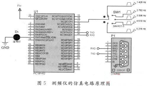 測頻儀的硬件電路主要包括兩個方麵:頻率測量電路和數據通信電路。頻率測量是指使用PIC18F452的CCP模塊測量外部脈衝信號的頻率;數據通信是指將測量得到的數據通過串口傳至PC機進行處理。測頻儀的硬件電路如圖3所示。