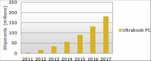 雖然最近兩年由於超薄筆電高售價與超薄顯示器供應限製等因素,市場將無法快速增長;但是未來作為新型計算機產品,超薄筆電更時尚的設計、實時啟動和電池待機時間長等特性,有望於在預測後期拉動市場需求。到2017年,筆記型計算機預計將出貨4億3千2百萬台。