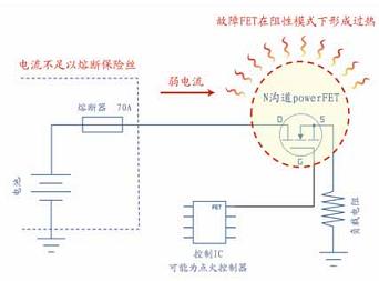 圖1 說明了一個出現故障的powerFET可能並不會產生一個完全硬短路的過流情況,而是產生阻性短路,因此通過I2R發熱造成不安全的溫度。在這種情況下,所形成的電流可能並沒有高到使一個標準保險絲熔斷並阻止印製電路板上的熱失控。