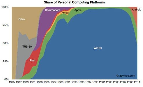 美國市場調研公司Asymco分析師賀拉斯·德迪歐(Horace Dediu)發布報告稱,傳統x86架構Windows PC(Wintel)在全球個人計算設備中的份額已經降至50%左右。在1995年至2005年期間,Wintel曾幾近完全壟斷個人計算設備。