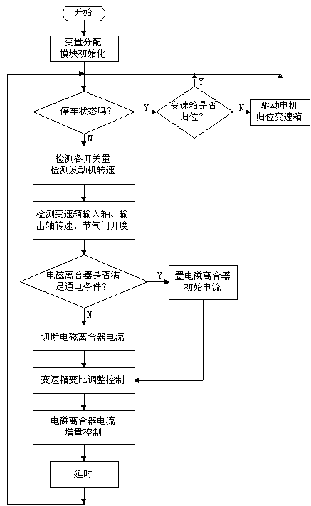 TCU控製係統主程序框圖如圖3所示。程序首先對內部RAM進行分配,然後對各功能模塊如Administrator/D轉換器、定時器、PWM波(bo)形(xing)發(fa)生(sheng)器(qi)等(deng)進(jin)行(xing)初(chu)始(shi)化(hua)。變(bian)速(su)箱(xiang)的(de)變(bian)比(bi)在(zai)汽(qi)車(che)每(mei)次(ci)時(shi)應(ying)處(chu)於(yu)最(zui)小(xiao)變(bian)比(bi)的(de)位(wei)置(zhi),因(yin)此(ci)在(zai)每(mei)次(ci)停(ting)車(che)時(shi)應(ying)將(jiang)變(bian)速(su)箱(xiang)歸(gui)位(wei),汽(qi)車(che)起(qi)動(dong)後(hou)首(shou)先(xian)檢(jian)測(ce)各(ge)參(can)數(shu),如(ru)檔(dang)位(wei)開(kai)關(guan)、發動機轉速、節氣門開度、變速箱輸入、輸出軸轉速等。這些參數是控製電磁離合器電流和電動機狀態的依據。當需要增加變速箱的變比時,TCU控製電機正轉,反之控製電機反轉。電磁離合器的控製采用電流增量控製方式。它的控製好壞,直接影響汽車運行的平穩性和經濟性。