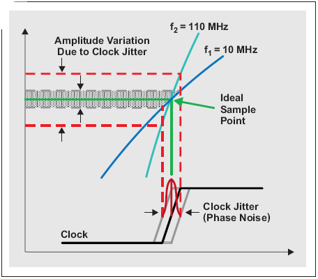 仔細觀察某個采樣點,可以看到計時不準(時鍾抖動或時鍾相位噪聲)是如何形成振幅變化的。由於高 Nyquist 區域(例如,f1 = 10 MHz 到 f2 = 110 MHz)欠采樣帶來輸入頻率的增加,固定數量的時鍾抖動自理想采樣點產生更大數量的振幅偏差(噪聲)。另外,圖 2 表biao明ming時shi鍾zhong信xin號hao自zi身shen轉zhuan換huan速su率lv對dui采cai樣yang時shi間jian的de變bian化hua產chan生sheng了le影ying響xiang。轉zhuan換huan速su率lv決jue定ding了le時shi鍾zhong信xin號hao通tong過guo零ling交jiao叉cha點dian的de快kuai慢man。換huan句ju話hua說shuo,轉zhuan換huan速su率lv直zhi接jie影ying響xiang ADC 中時鍾電路的觸發閾值。