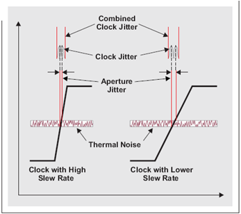 我們在產品說明書中可以找到 ADC 的孔徑口抖動 (aperture jitter)。這一值一般與時鍾振幅或轉換速率一起指定,記住這一點很重要。低時鍾振幅帶來低轉換速率,從而增加窗口抖動。