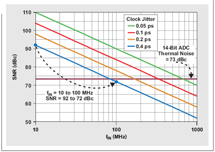正如我們預計的那樣,利用固定數量的時鍾抖動,SNR 隨輸入頻率上升而下降。圖 4 描述了這種現象,其顯示了 400 fs 固定時鍾抖動時一個 14 位管線式轉換器的 SNR。如果輸入頻率增加十倍,例如:從 10MHz 增加到 100MHz,則時鍾抖動帶來的最大實際 SNR 降低 20dB。