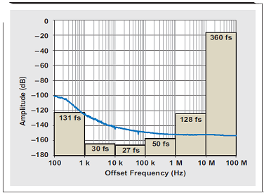 時鍾鏈(振蕩器、時鍾緩衝器或 PLL)中器件的輸出抖動一般規定在某個頻率範圍內,該頻率通常偏離於基本時鍾頻率 10 kHz 到 20 MHz(單位也可以是微微秒或者繪製成相位噪聲圖),可以將其整合到一起獲取抖動信息。但是,低端的 10kHz 和高端的 20MHz 有時並非正確的使用邊界,因為它們調試依賴於其他係統參數,我們將在後麵進行詳細介紹。圖 6 描述了設置正確整合限製的重要性,圖中的相位噪聲圖以其每十倍頻抖動內容覆蓋。我們可以看到,如果將下限設定為 100-Hz 或 10kHz 偏移,則產生的抖動便極為不同。同樣地,例如,設置上整合限製為 10 或 20MHz,可得到相比 100MHz 設置極為不同的結果。
