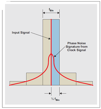 在采樣過程中,輸入信號與采樣時鍾信號混頻在一起,包括其相位噪聲。當進行輸入信號 FFT 分析時,主 FFT 容器 (bin) 集中於輸入信號。采樣信號周圍的相位噪聲(來自時鍾或輸入信號)決定了鄰近主容器的一些容器的振幅,如圖 7 所示。因此,小於 1/2 容器尺寸的偏頻的所有相位噪聲都集中於輸入信號容器中,且未增加噪聲。因此,相位噪聲整合帶寬下限應設定為 1/2 FFT 容器尺寸。 FFT 容器尺寸計算方法如下: