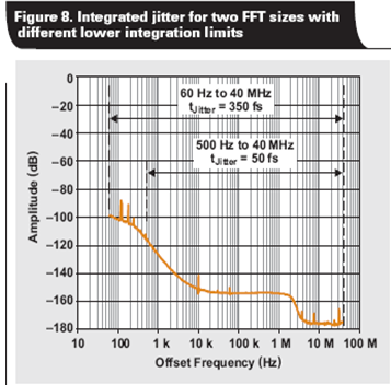 圖 6 所示相位噪聲圖抖動貢獻量為 ~360 fs,其頻率偏移為 10 到 100MHz 之間。這比 100Hz 到 10MHz 之間偏移的所有 ~194 fs 抖動貢獻值要大得多。因此,所選整合上限可極大地影響計算得到的時鍾抖動,以及預計SNR匹配實際測量的好壞程度。