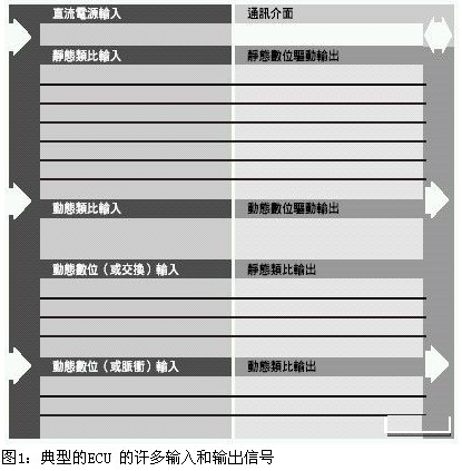 ECU 利用許多信號來監控汽車及其環境,進而管理與控製引擎和輔助設備,以達到最佳的運作狀態。圖1摘要了典型的ECU 的許多輸入和輸出信號。