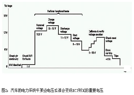 依汽車的操作狀態而定,在汽車的電力係統中常會碰到某些電壓位準。這些位準會變成ECU測試的重要電壓,如圖2所示。在這些重要電壓下執行的一些相關測試包括: