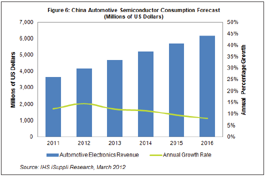 在幾個關鍵因素的推動下,中國汽車半導體消費2016年以前的複合年度增長率將達11%。