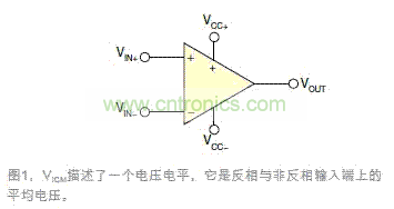 認識VICM還有一種方式,即它是非反相和反相輸入端VIN+與VIN-的公共的電壓電平。在大多數應用中,VIN+非常接近於VIN-,因為閉環負反饋會使一個輸入端密切跟蹤另一個輸入端,使VIN+與VIN-之間的壓差接近於零。很多共模電路都是這種情況,包括電壓跟隨器,以及反相和非反相配置。這些情況下,通常會假設VIN+=VIN-=VICM,因為這些電壓幾乎是相同的。