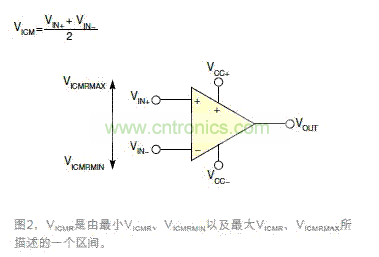 其中,VICMRMIN是相對VCC-電壓軌的極限值,VICMRMAX是相對於VCC+電壓軌的極限值(圖2)。