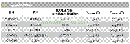 表1是德州儀器公司幾款運放及其VICMR。最大電源區間欄中描述了雙電源和單電源的極限。表中可以明顯看到,不同運放的輸入區間VICMR各不相同。根據器件的類型,VICMR可能進入或超出電源軌。因此,永遠不能假定某個運放可以接受某個輸入信號區間,除非驗證了數據表中的規格。
