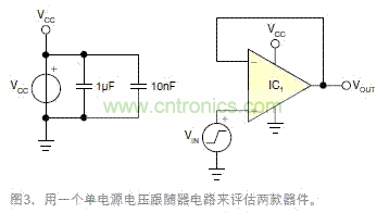 為更好地理解違反VICMR的效果,下麵給出一些實例。用兩隻具有不同VICMR規gui格ge的de運yun放fang可ke演yan示shi這zhe些xie效xiao果guo。這zhe些xie器qi件jian都dou有you軌gui至zhi軌gui的de輸shu出chu,排pai除chu了le輸shu出chu級ji造zao成cheng的de限xian製zhi。一yi個ge單dan電dian源yuan的de電dian壓ya跟gen隨sui器qi電dian路lu用yong於yu兩liang隻zhi器qi件jian的de評ping估gu(圖3)。所有測試均在一個實驗台上完成,室溫約為25°C。