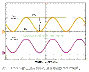 測試電路時,在其輸入端加一個直流偏移為VCC電壓一半(或5V)的300Hz正弦波。調 節交流幅度,直到看到VOUT有一個變化。當施加10V峰峰值輸入時,VOUT顯示一個接近正電源軌的削峰信號,而不是接近負電源軌。這個接近正電源軌的不良性能就是預計輸入超過9.2V時的結果。對於0~9.2V之間的VIN,VOUT顯示和預期一樣的正確波形(圖4)。