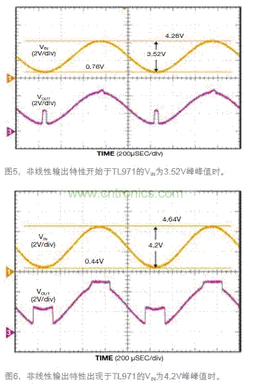 VIN中心在2.5V時,VIN增加到2.7V峰峰值,VOUT都有預期的線性特性。當VIN增加到約3.5V峰峰值時,中心在2.5V,VOUT繼續跟隨VIN,表現出正確的運放特性。注意這個線性特性好於數據表對VICMR的限製,但仍然超出了保證的極限值。當VIN增加到略高於3.52V峰峰值時,VOUT開始在接近正電源5V軌和負電源0V軌時表現出非線性特性(圖5)。VIN進一步增加到4.2V峰峰值,明顯超出了VICMR。當輸入峰值超過了近正電源軌的極限時,VOUT的信號輸出超出電源軌,跳到正電源軌5V以上,並停留在這裏,直到VIN回到可接受範圍內(圖6)。當輸入跌到接近負電源軌的極限以下時,VOUT的信號表現出一個相位反轉,跳至中軌2.5V,並以一個偏移跟隨VIN,直到VIN增加到VICMR內的一個可接受電壓值。