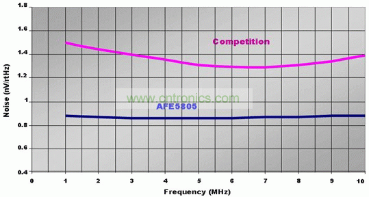 為了滿足上述標準,我們需要一個超聲波 AFE(例如 TI 的 AFE5805)。最為先進的 BiCMOS 和 CMOS 技術用於對功耗和噪聲性能進行優化。由於其低功耗、小芯片尺寸以及較低的閃爍噪聲, BiCMOS 工藝是 AFE5805 VCA 部分的理想之選。CMOS 工藝非常適用於模數轉換器。與同類解決方案相比,這些綜合的創新使尺寸縮小了 50%,功耗降低了 20%,噪聲減少了 40%。圖 2 所示的恒 定噪聲性能涵蓋了整個工作頻率範圍。因此,我們設計的便攜式超聲波係統,可以實現卓越的圖像質量以及最低的功耗。