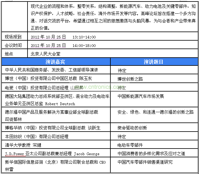歡(huan)迎(ying)您(nin)參(can)加(jia)第(di)六(liu)屆(jie)中(zhong)國(guo)國(guo)際(ji)汽(qi)車(che)零(ling)部(bu)件(jian)發(fa)展(zhan)高(gao)峰(feng)論(lun)壇(tan)。該(gai)論(lun)壇(tan)作(zuo)為(wei)中(zhong)國(guo)國(guo)際(ji)汽(qi)車(che)零(ling)部(bu)件(jian)博(bo)覽(lan)會(hui)的(de)品(pin)牌(pai)活(huo)動(dong),已(yi)成(cheng)功(gong)舉(ju)辦(ban)五(wu)屆(jie)。吸(xi)引(yin)了(le)數(shu)千(qian)名(ming)來(lai)自(zi)全(quan)球(qiu)各(ge)地(di)的(de)汽(qi)車(che)及(ji)零(ling)部(bu)件(jian)企(qi)業(ye)高(gao)管(guan)、行業協會領導、政府相關主管單位、新聞媒體等參會,峰會規模和影響力得到了廣泛認可,被譽為汽車零部件行業的“智庫峰會”。