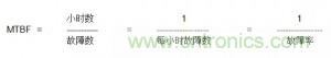 想要將一個部件的材料清單(BOM)與另一個部件的材料清單進行比較會怎麼樣呢?能不能將每個元件的MTBF簡單地加在一起,來確定總體可靠性呢?可惜的是:不可以。這是因為MTBF代表的是出現故障的小時數,按照加法計算是不起作用的。然而,故障率,一個代表每小時發生故障的次數,是可以相加。慶幸的是將MTBF轉換成故障率僅是一個很簡單分數關係。以下是公式: