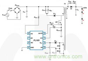 低功率照明包 括蠟燭、照明球燈泡和 20W 以下的白熾燈。 這些是小燈泡,主要用於住宅和零售場所。 尺寸和成本是兩個最大的關注點,所以使用初級端調節 (PSR) 拓撲是一個很好的選擇。 一個 PSR 控製器僅使用 LED 燈控製器初級端的信息來精確控製輸出電壓和電流。 消除了輸出電流檢測損耗並取消了次級反饋電路。 結果是設計用更少外部元件,滿足更緊密的恒定輸出電流要求。 一個 20W 的 LED 負載,以 80% 的功率啟動,熱損失約 4W。 圖 1 是一個使用 FL103 的電路樣本,飛兆 FPS™ 功率開關器件,是一個帶 PSR 功能的控製器。