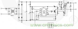 在中等功率範圍,LED 燈泡設計適合於筒燈和 L 形燈中使用,運行時最高功率為 50W。 為了滿足調節要求,功率因素校正 (PFC) 為必要元素。 為 PFC 增加電路,可使之緊密結合。 使用單級 PFC 拓撲是節約占位麵積和成本的好辦法,因為它不需要在全橋整流二極管後使用大型電解電容。 圖 3 為一個使用 FL6961 的反激式轉換器,PFC 控製器以臨界導通模式 (CCM) 運行,而且擁有軟啟動和逐周期電流限製等功能。