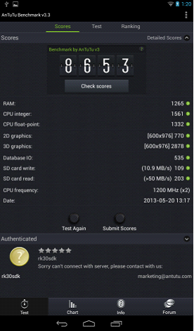 對於平板用戶來說,瀏覽網頁肯定是必備的功能,在此項專門針對的網頁瀏覽的性能測試中,RK3168以1427的高分遠遠領先於A20。